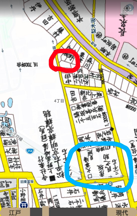 逆さまの古地図ですが、手前の信号の横に青く囲ってあるのが「口火火事」と「松平右京明輝…」の間の道です。角に現在は 「伸寿司」があります。地図の赤丸辺りが山口家のあった場所と推測されます。斎藤一の実兄山口廣明(こうめい)の家。明治期になって、斗南から藤田五郎がご家族と上京した際一時的に身を寄せていたという説もあります。