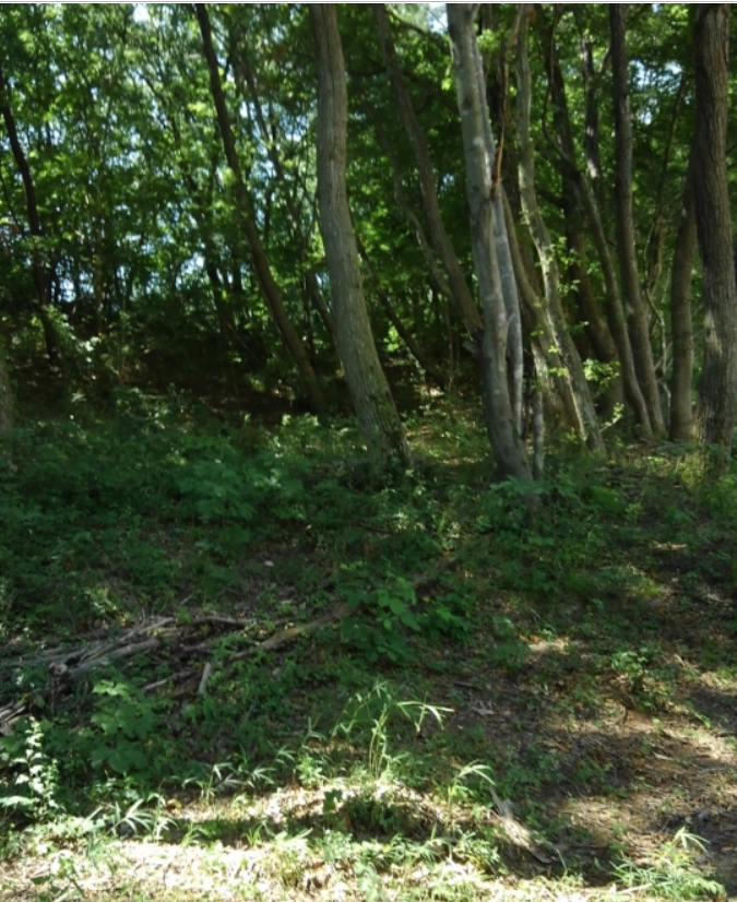 この丘陵の奥に雷神神社があって丘陵の中腹が台地のようになっています。(神社の登り口は川沿いの別の道にありました。)