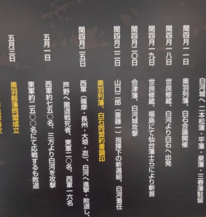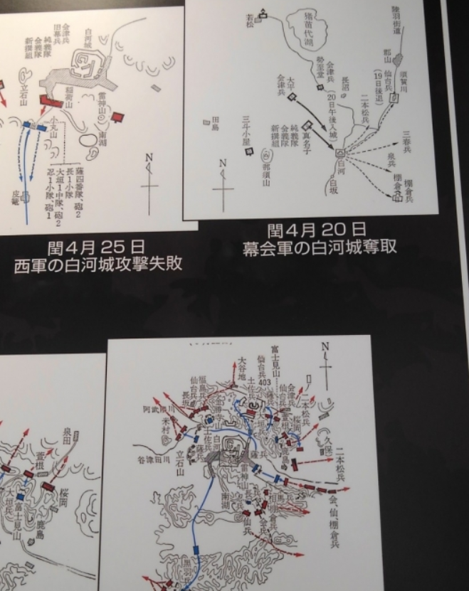 写真は白河戦線の図と斎藤一の参戦した日が記された年表(脇本陣近くのマイタウン白河という市の施設に展示されています、戊辰戦争の詳しい映像説明が随時上映されていて、斎藤一の写真画像や新選組の情報も見られます)