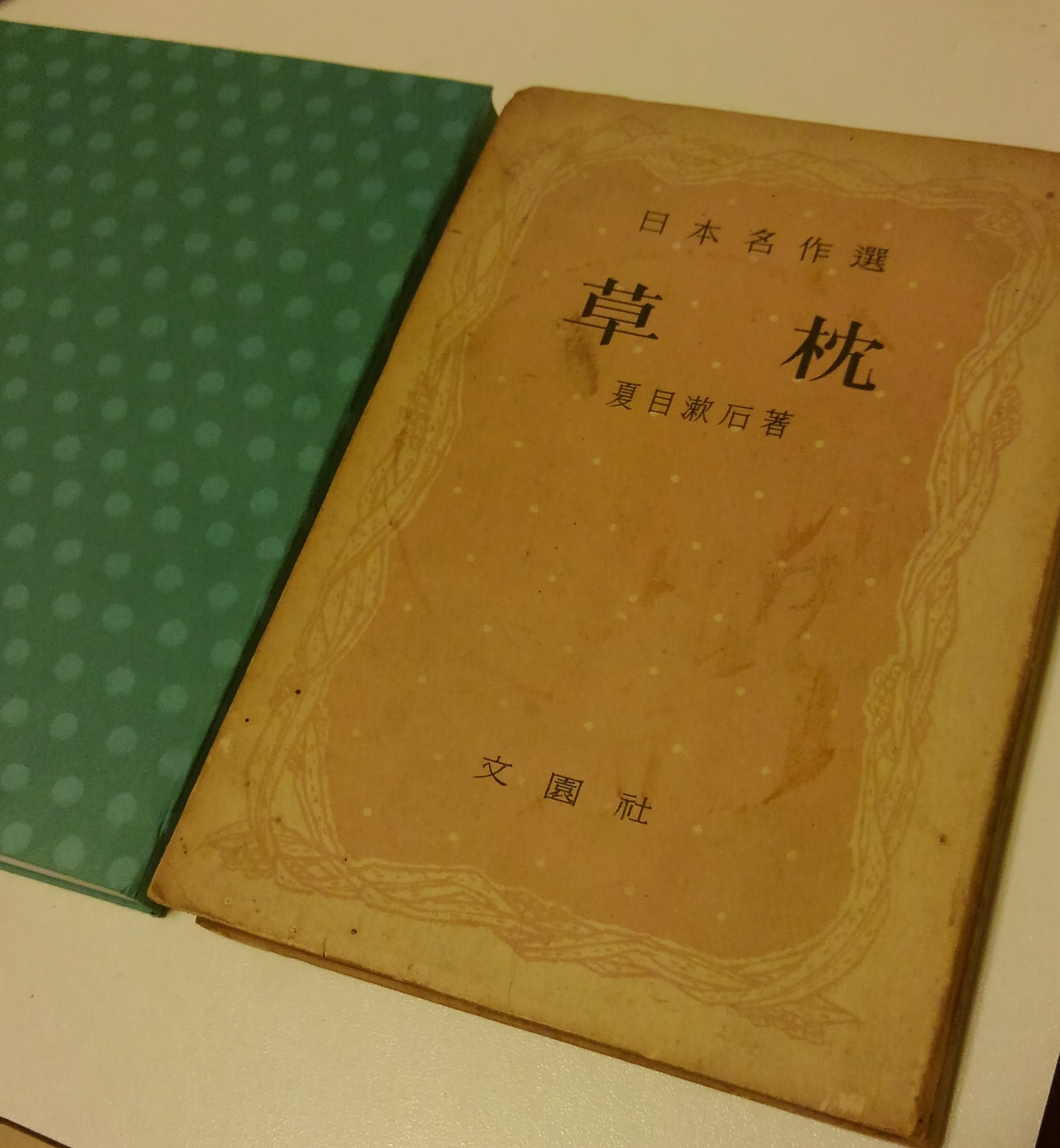 大きさが分かり易いように、文園社の古本と並べました。フランス装はカバーを固めの紙で中表紙を折り紙のように包んでたたみます。ハードカバーとソフトカバーの中間ぐらいの書籍です。文字は游明朝で組んでいます。古書っぽい仕上がりです。