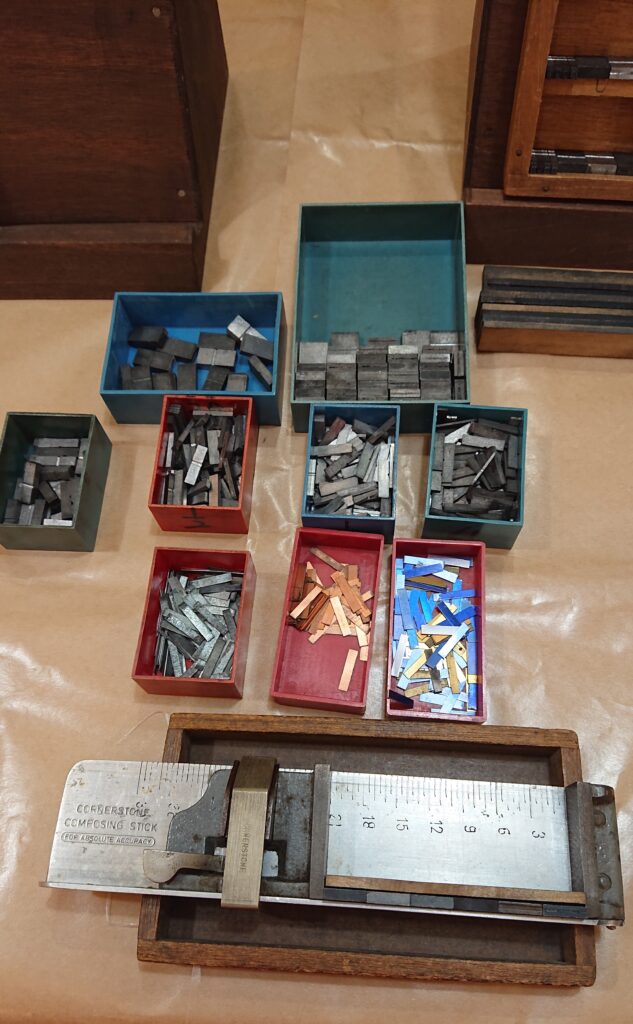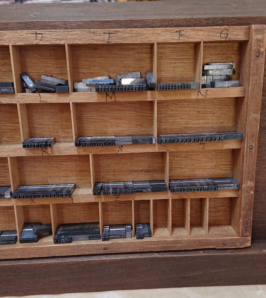 自分の名前をアルファベット表記したものを、ひたすら文字と文字のスペースを見詰めて、調節します。ワードソフトなど使って英文を打つと、自然に文字間隔は調整されますが、活版は手作業で一文字一文字を均等に調整します。実際、薄い銅板の板を挟んだり、外したりしながら調整が必要で、非常に細かな作業でした。