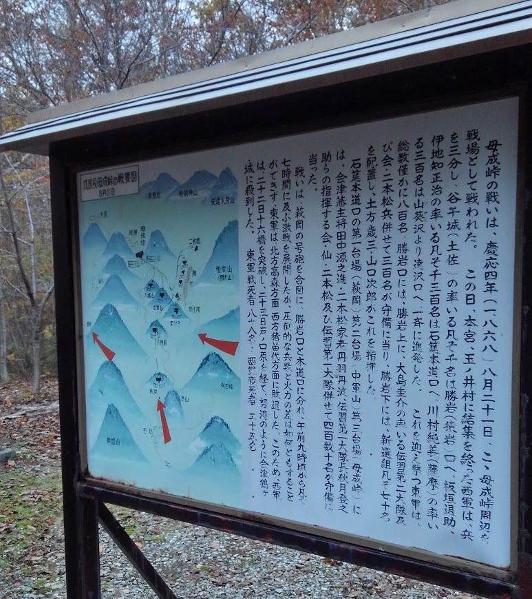 母成峠東軍戦没碑のそばの説明表示です。真ん中あたりに、「勝岩下(猿岩)」に山口二郎が配置したと書かれています。(土佐藩の谷干城率いる千名の兵と対峙。拡大するともっと良くみえるかも。旧いスマホで撮影したので不鮮明ですみません)勝岩下は、かなり岩場で山道もない場所。現在でも、かなりの装備がないと地形的に接近は無理ということです。