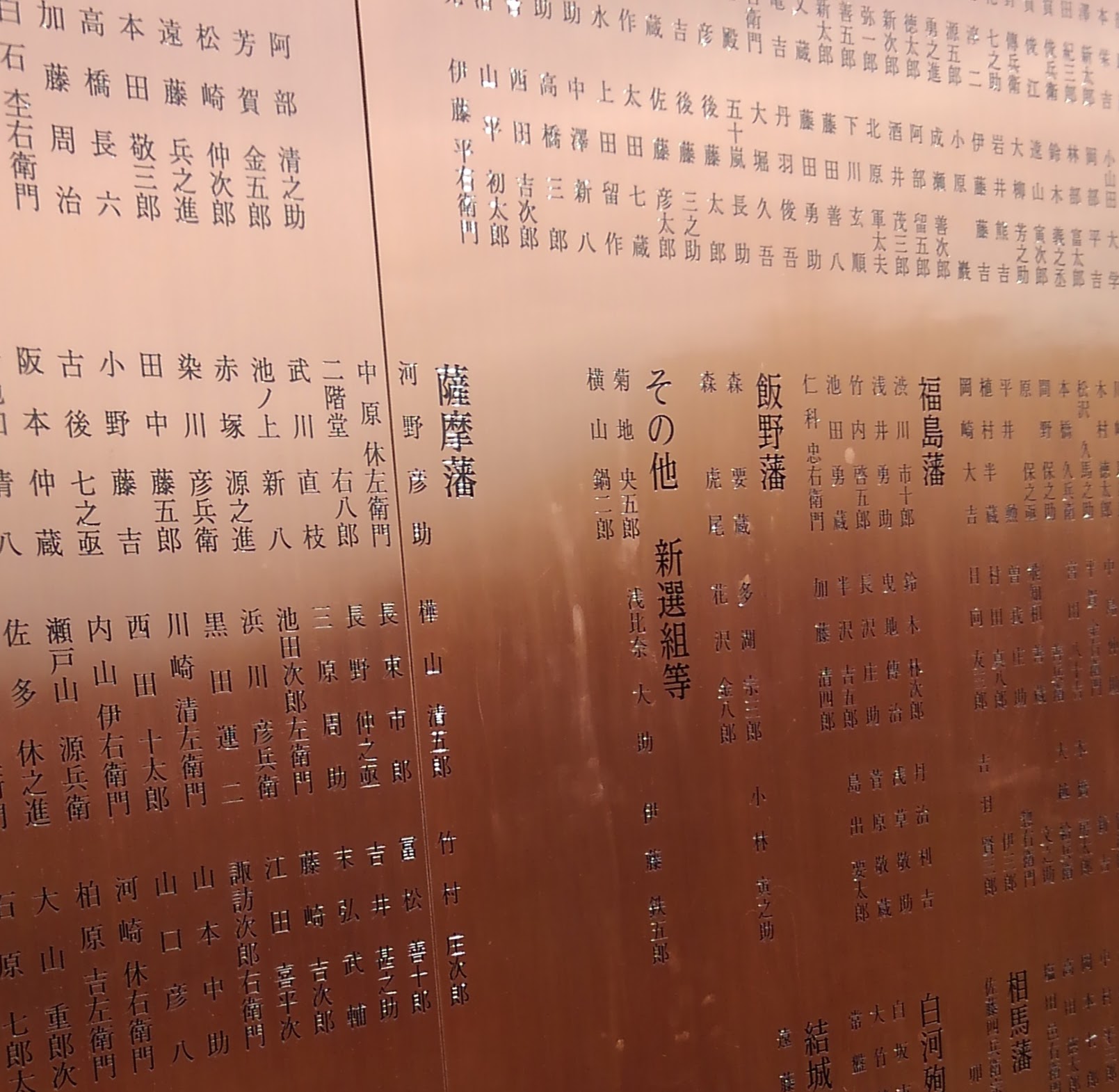 新しい碑は銅板で出来ていて、戦死者の名簿が彫られています。新選組隊士の菊地央五郎と記名されています。隣の薩摩藩兵に武川直枝の名前が見えます。もと新選組、高台寺派の清川清です。写真に名前があるのに、今気付きました