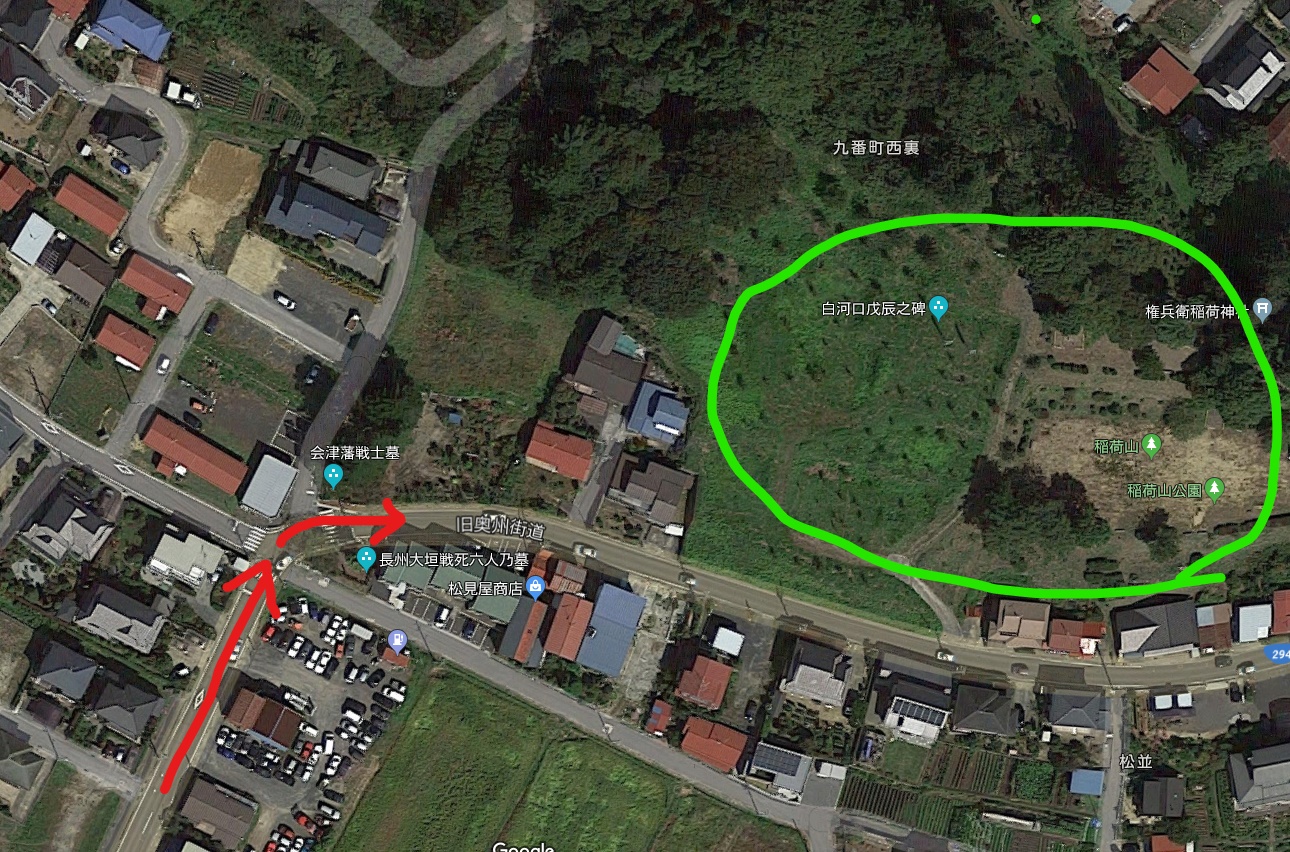 緑の部分が、斎藤さんが陣を築いた稲荷山です。この地図には写っていませんが、稲荷山の北方面に白河城が位置しています。赤い矢印が、新政府軍が攻め込んで来たルート、この地図の下方面が那須芦野宿に繋がる旧奥州街道です。曲がり角の部分が「食い違い土居」で、街道は真っ直ぐに進むことが出来ない状態。街道を赤い矢印で進んでくる敵軍は右に曲がる時に失速します。現在この曲がり角に「会津藩兵の墓」があり史跡になっています。当時、ここで砲撃を交わしました。稲荷山上には、比較的新しい白河口戊辰の碑が立っていて、そこには戦死者の名簿がはっきりと刻まれています。新選組隊士の名前も見られます。