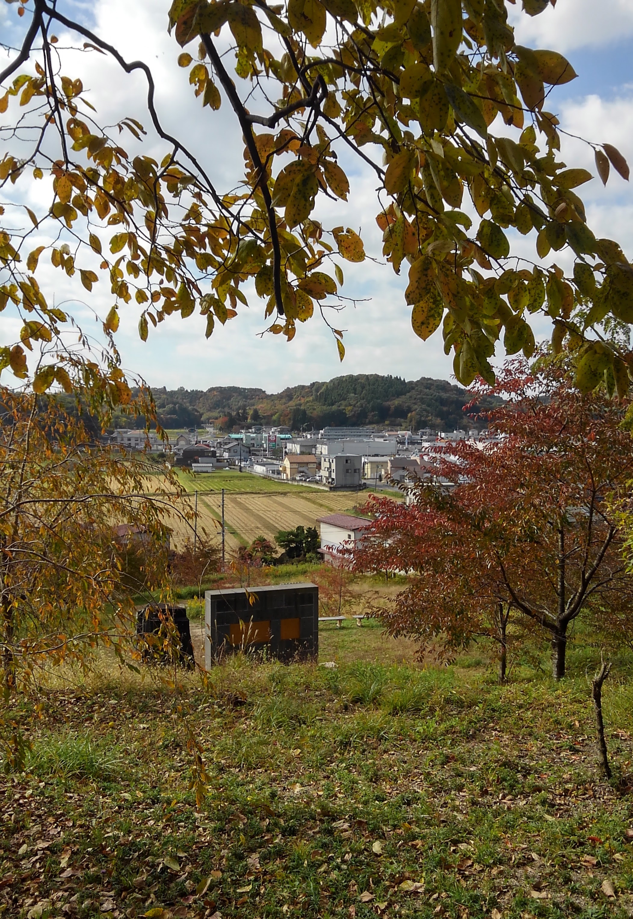 稲荷山山頂から南側小山丘陵を見た写真。田圃の向こうの建物が旧奥州街道に並んでいます。小山丘陵の向こうが那須山系、白坂宿、芦名宿に繋がります。紅葉の季節に撮影。白河戦争中はもっと緑の葉がいっぱい茂っていたと思われます。